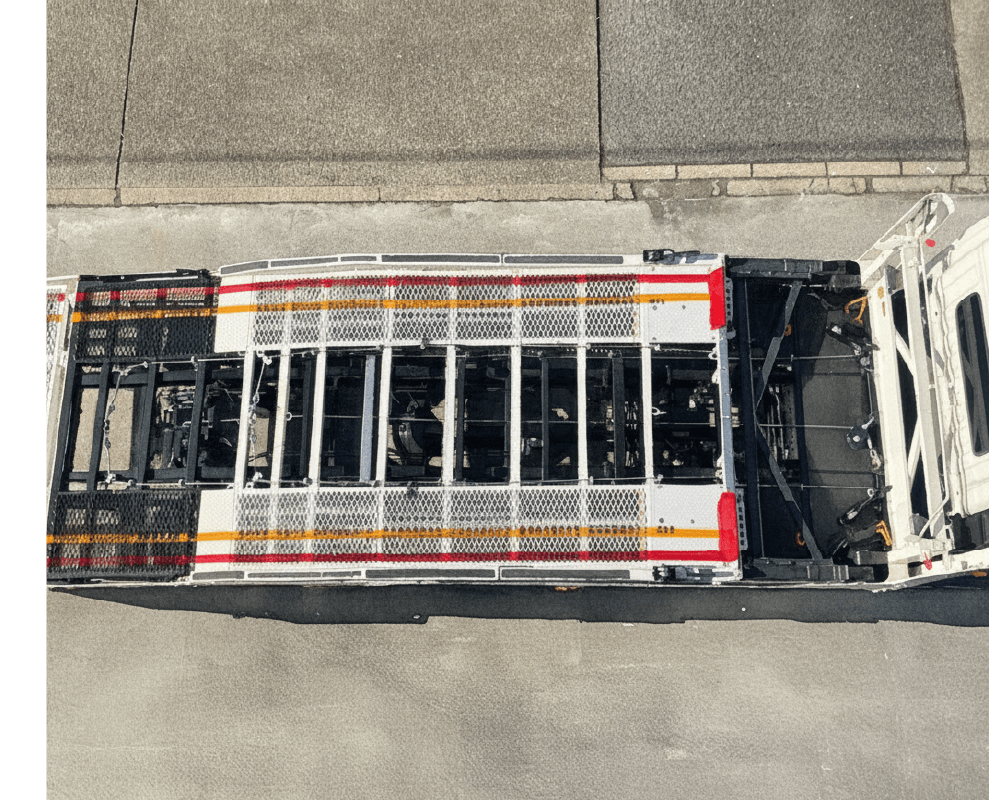 お客様の思い描いている固縛方法をもとに検討を行い、幅広く対応可能な位置に補強やハシゴ加工を施しました。実際に使用されるドライバーの方が、容易かつ確実に固縛できるよう改造を行いました。